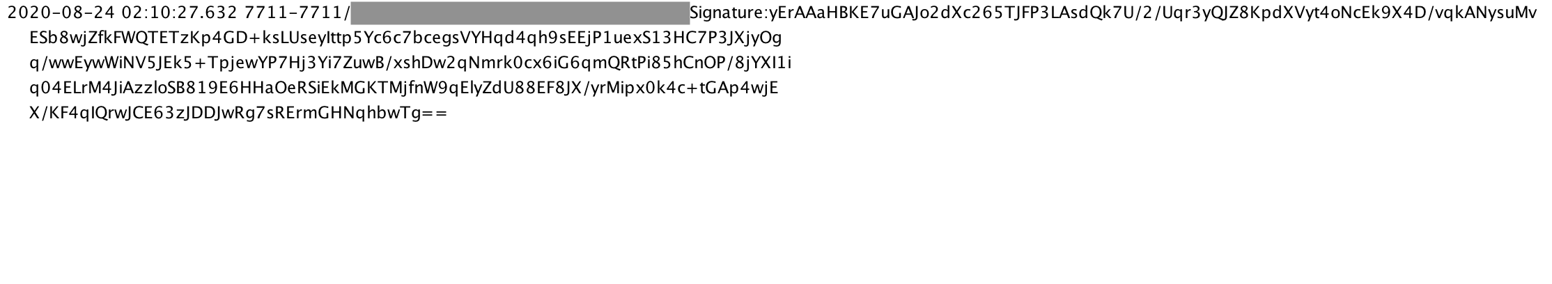 String signatureStr = Base64.encodeToString(signatureBytes, Base64.DEFAULT); Log.d(TAG, "Signature:" + signatureStr); - 결과 -> 개행문자가 삽입(줄 바뀜)되는 것을 확인할 수 있다.
