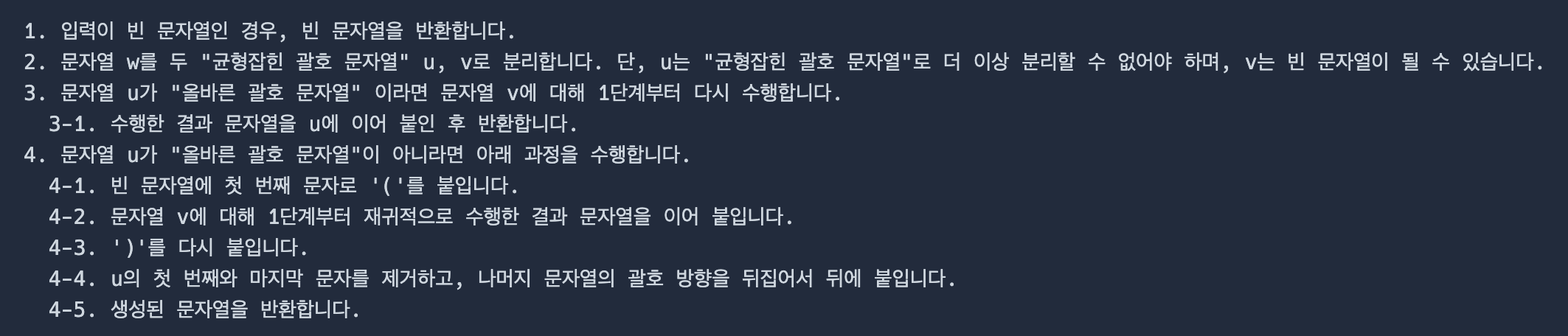 | 4-2. 문자열 v에 대해 1단계부터 재귀적으로 수행한 결과 문자열을 이어 붙입니다. |