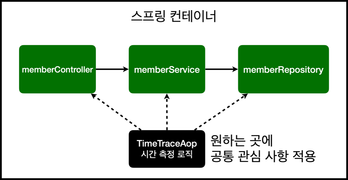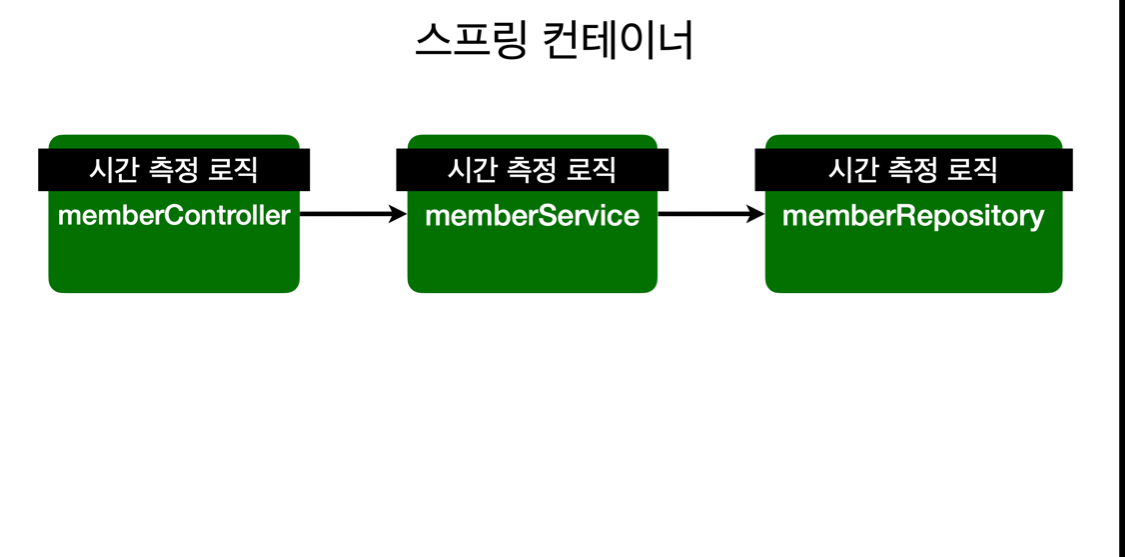 - 시간을 측정하는 로직은 공통 관심 사항이나, 핵심 비즈니스 로직과 섞이게 되어 유지보수가 어렵다.
