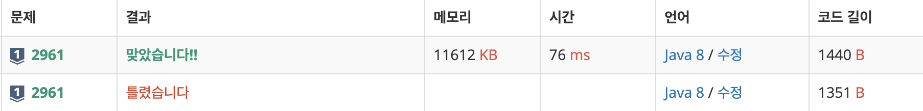 [백준/boj] 2961: 도영이가 만든 맛있는 음식 (Java) / 브루트포스 알고리즘 / 부분 집합 본문