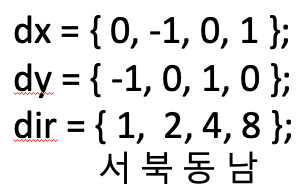 // dir = {1, 2, 4, 8}; 서, 북, 동, 남 순서