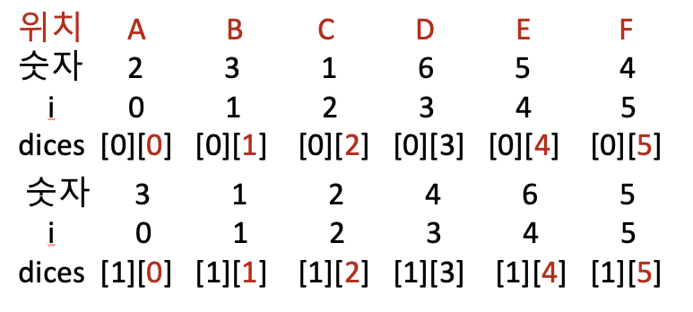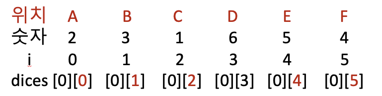 - dices[][] : N개의 주사위를 받아와 정보를 저장한다. 예를 들어, dices[0][2]는 첫번째 주사위의 C번에 써있는 숫자이다.