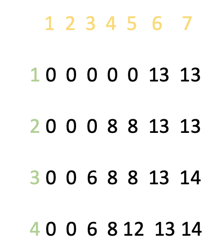 - dp[i][j] (int) : i번째 가방까지 살펴봤을 때, j 무게일 때 담을 수 있는 물건들의 최대 합