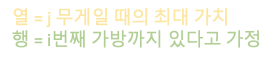 - i (int) : i 번째 물건까지 있다고 가정한다. (예를 들어, i = 2 이면 첫째줄 물건과 둘째줄 물건이 있을 때 담을 수 있는 최대 가치값을 dp[i][]에 담는다.)