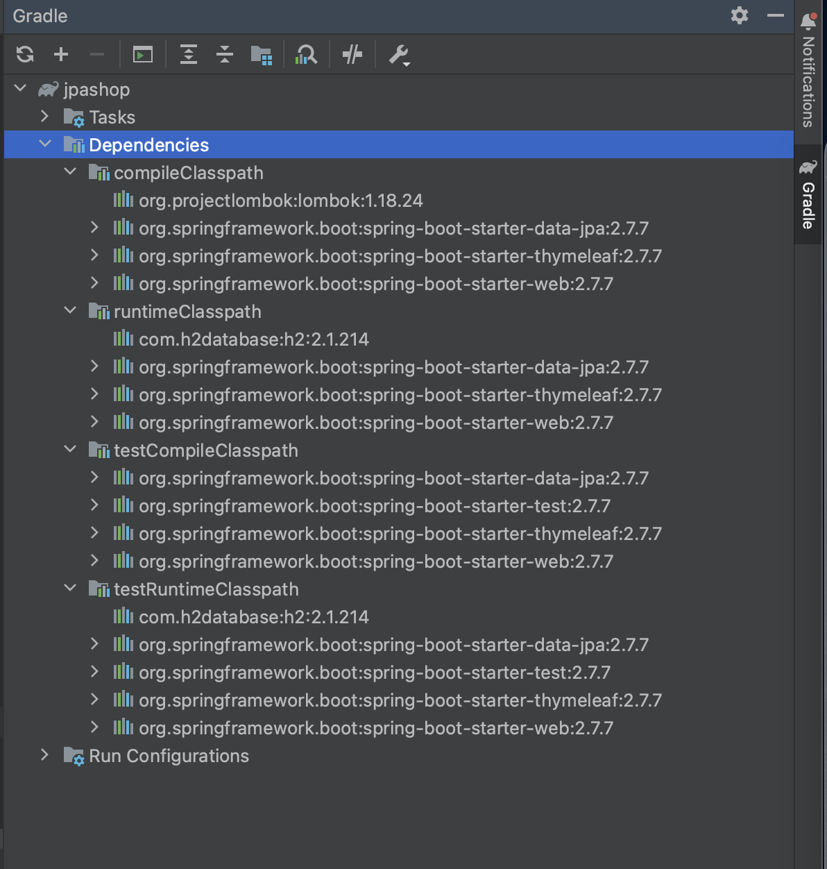 오른쪽 탭에서 Gradle > Dependencies 를 통해 라이브러리 의존성 확인 가능