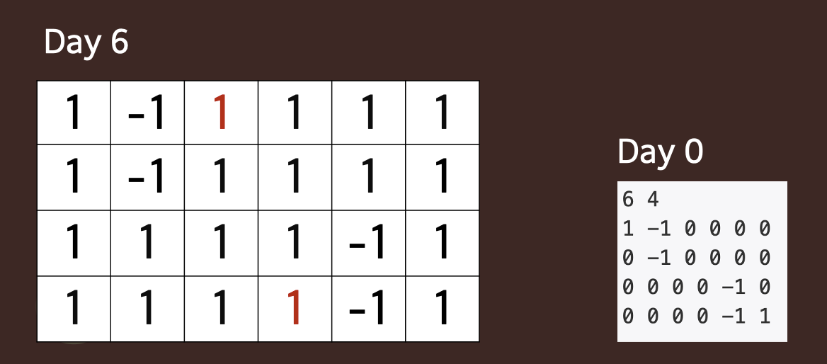 첫 줄에는 상자의 크기를 나타내는 두 정수 M,N이 주어진다. M은 상자의 가로 칸의 수, N은 상자의 세로 칸의 수를 나타낸다. 단, 2 ≤ M,N ≤ 1,000 이다. 둘째 줄부터는 하나의 상자에 저장된 토마토